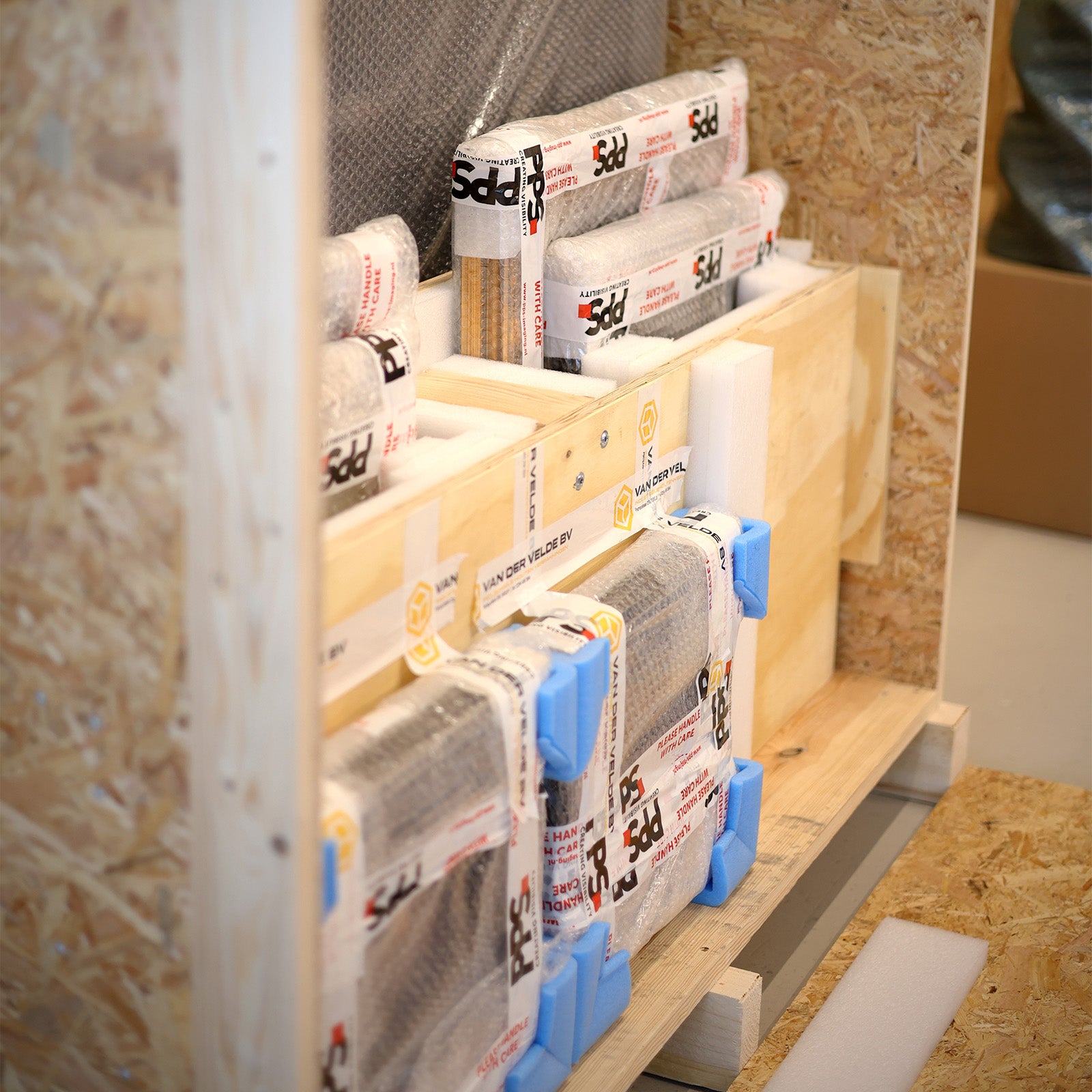 Uw kunstwerk wordt in onze aparte werkruimte zorgvuldig op maat verpakt met materialen afgestemd op het object en de reis.